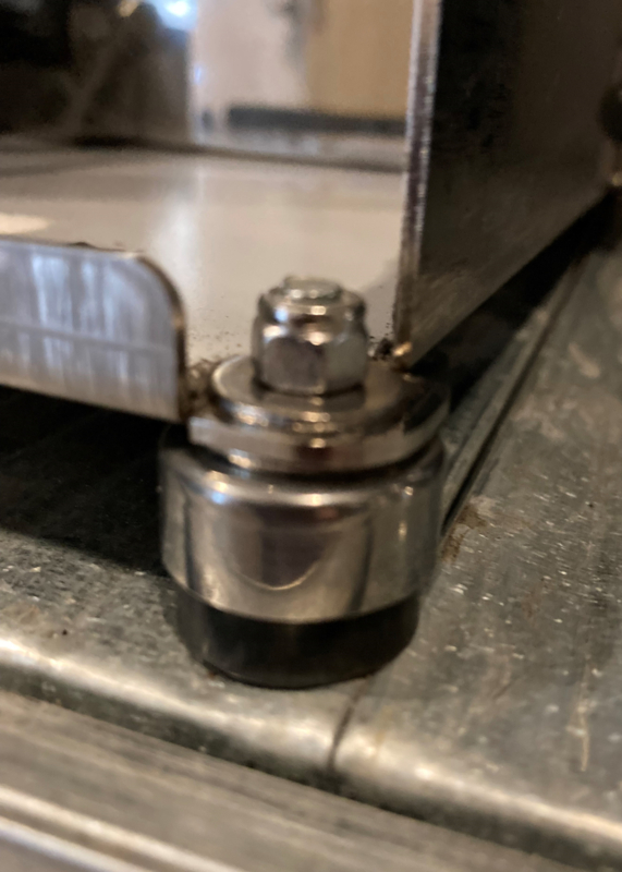 Wilt u steverige en iets hoger pootjes? Dan kunt u de pootjes van de Mazzer Mini eronder zetten. (monteren met 1 rvs M6 carosseriering tussen het voetje en de behuizing plaatsen zodat de lekbak mooi uitkomt en 1 rvs M5 carosseriering aan de bovenzijde ivm de grote van het montagegat, zie foto 2)