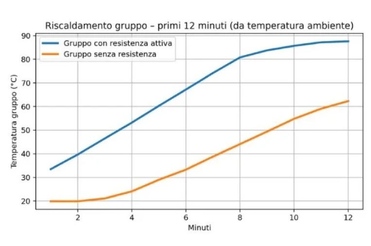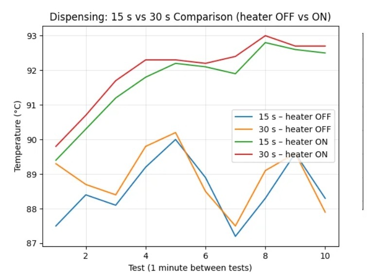 De thermische stabiliteit is getest middels 10 opeenvolgende shots met een interval van 1 minuut.De belangrijkste gemeten parameter is ΔT, het verschil in groeptemperatuur tussen 30 en 15 seconden extractie.